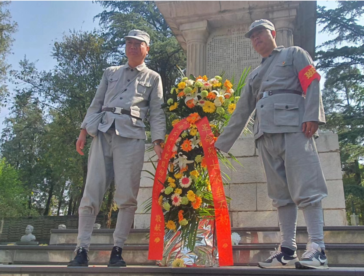 之后进行了授旗仪式,向革命英雄敬献花篮,云叶股份党支部书记盘文政、总经理张端一同整理挽联,全体人员向革命英雄鲜花,党员代表进行《圭山谣》诗歌朗诵,党支部书记盘文政带领全部党员重温入党誓词。